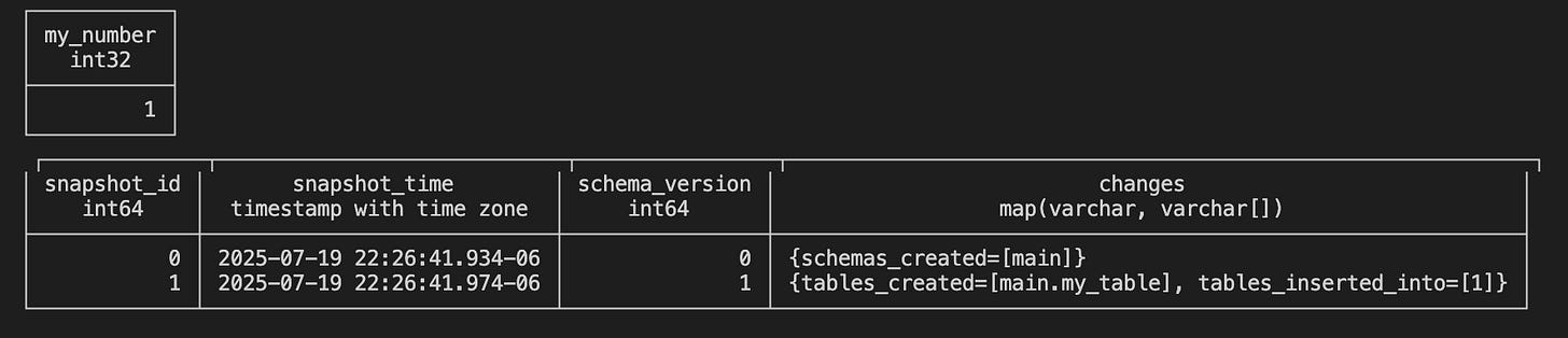 main() Make sure you have your Postgres instance running locally before running the script. The only difference between the first script and this one is using DuckDB or Postgres as the metastore. The output will be the same except the output value from the table is 2 in this script instead of 1.