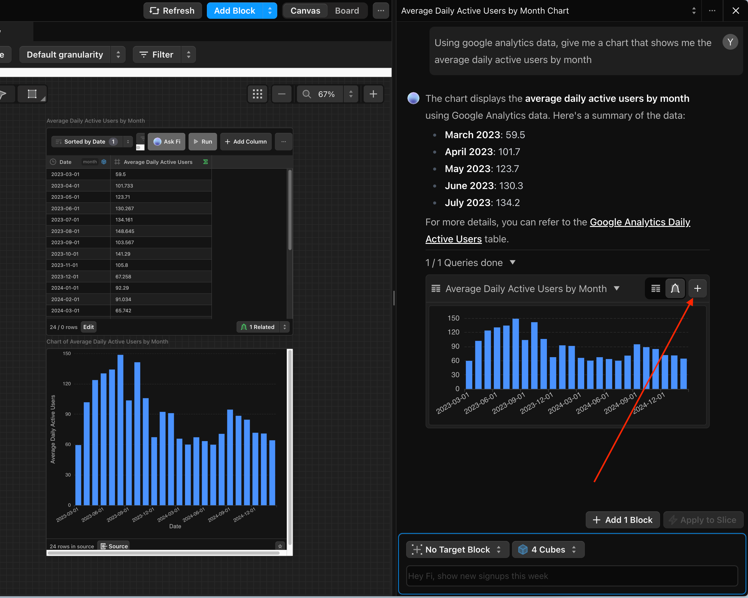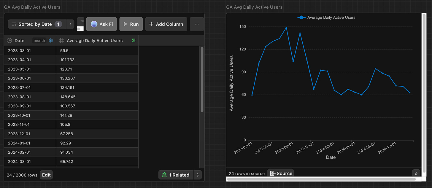 The below screenshot shows my analysis showing google analytics average daily active users by month. I created a table (Slice, is the name Definite uses) and added a line chart based off of that table.