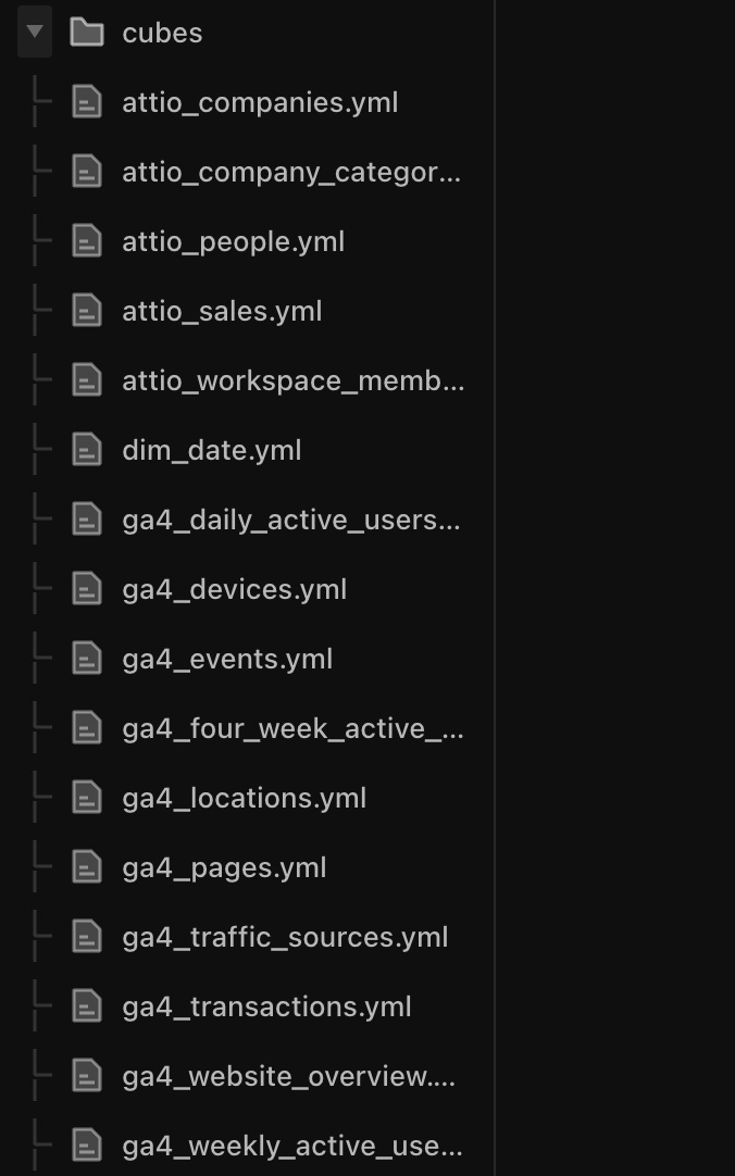 A simple example of this is the below screenshot. I connected my google analytics data to Definite, and it auto-populated Cube models for me. Now, I’m ready to start my analysis out-of-the box (you also see models for Attio, a CRM source I previously brought in):