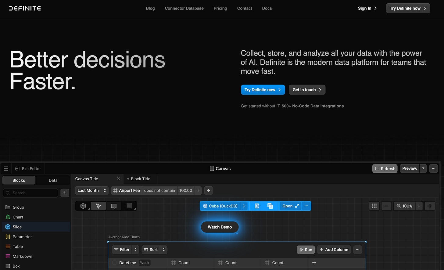 Definite is a one-stop shop for anything data. It handles from data ingestion, transformation, and to analytics all in one place with the power of AI. You connect your data source with no-code, you model data, and do your analysis directly in Definite. You won’t need to switch place between your data loading tool, your warehouse or other 100s of tools you can think of.
