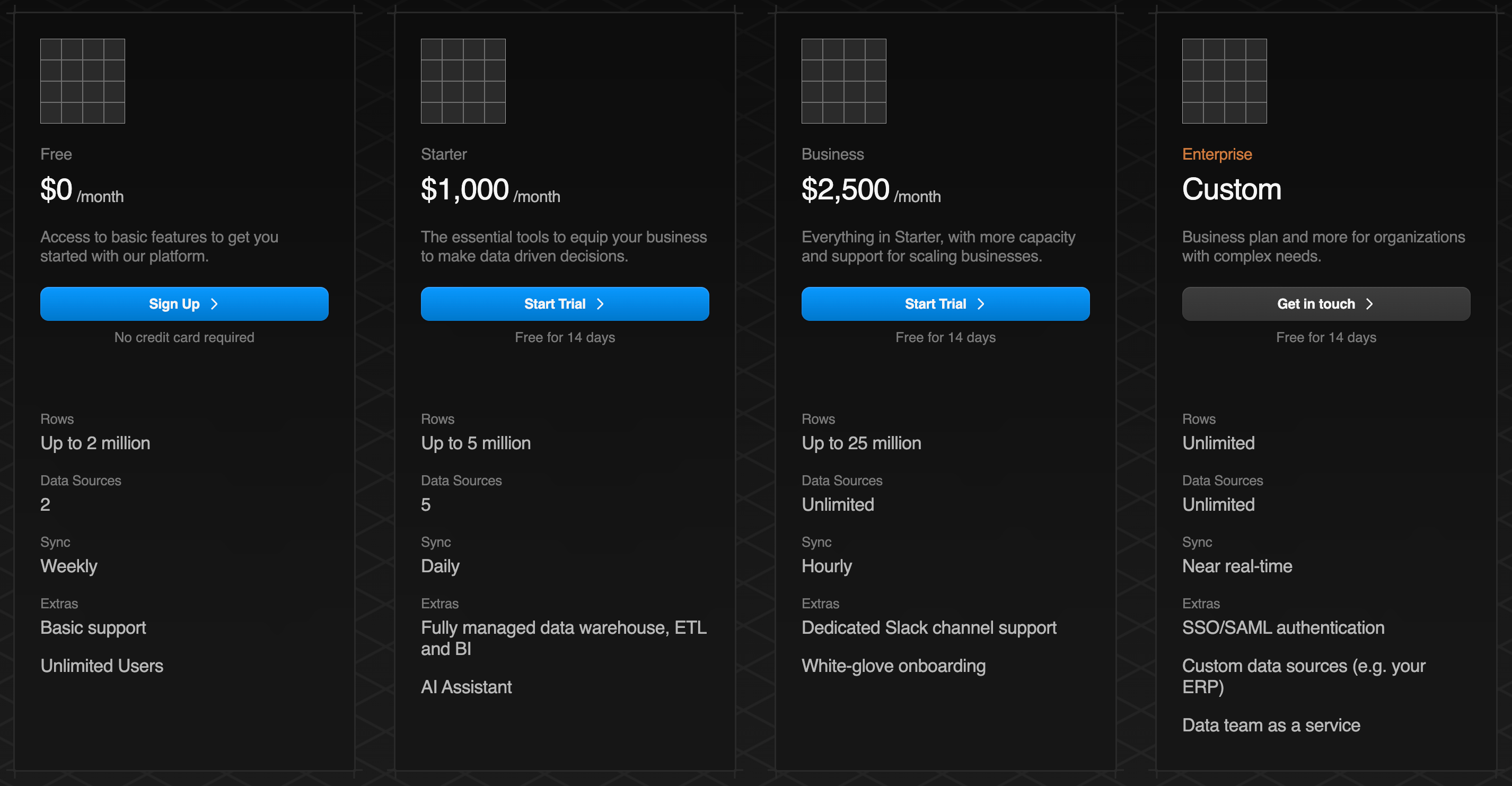 The free tier allows you to use up to 2 million rows of data with unlimited users. Once your data needs grow, you can upgrade to something like the Starter plan, which costs $1,000/month and it offers::