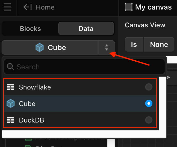 Once you ingested your data and/or connected your cloud data warehouse, you’ll have options to choose which database you want to use for your analysis in Definite’s Canvas: