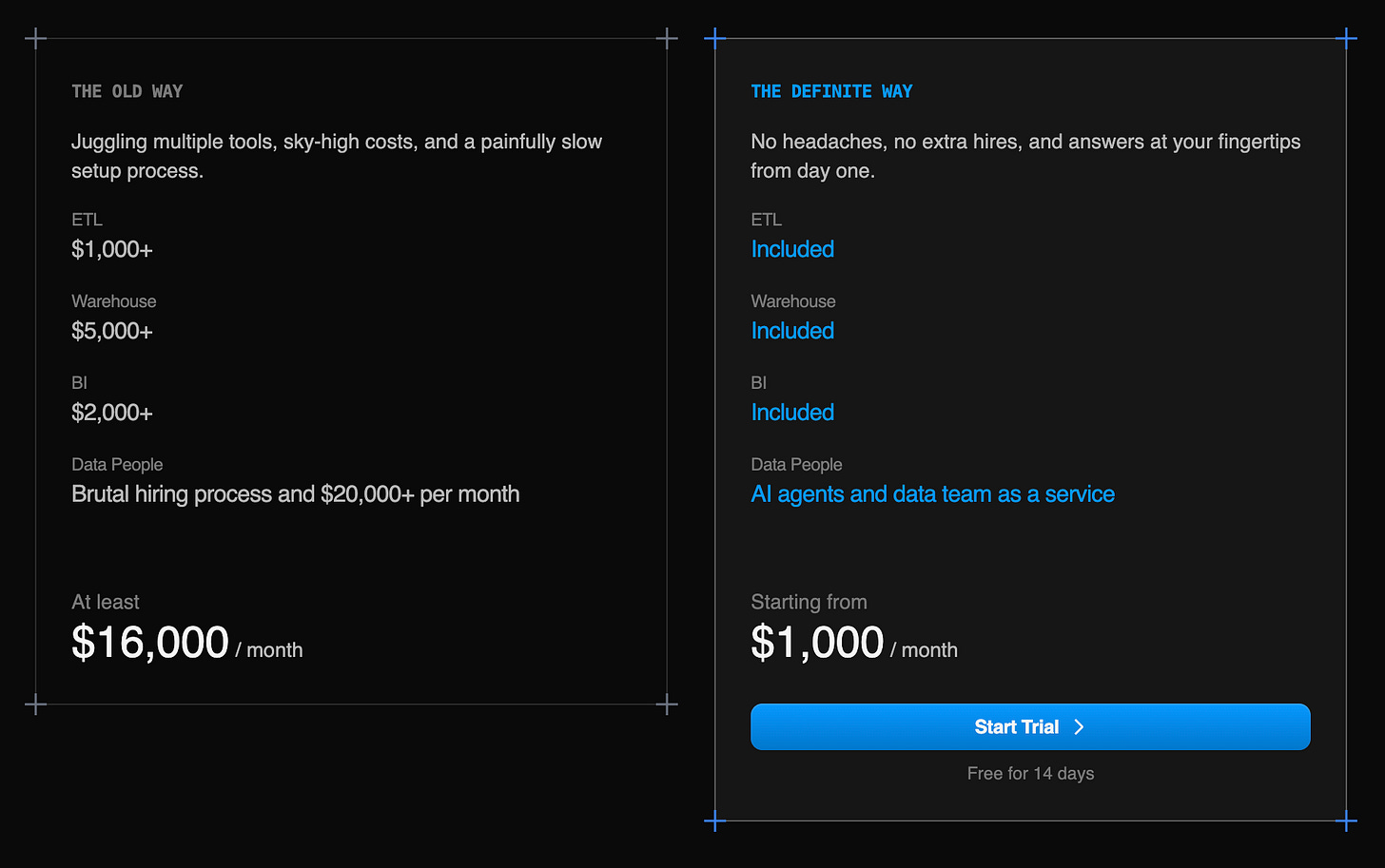 Below is a screenshot from Definite’s website, highlighting its strengths in pricing: