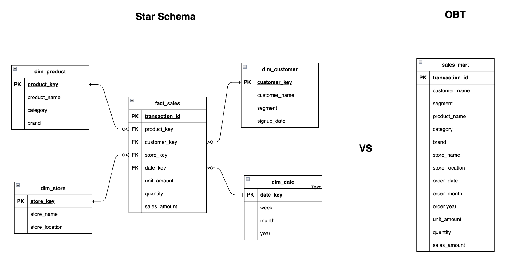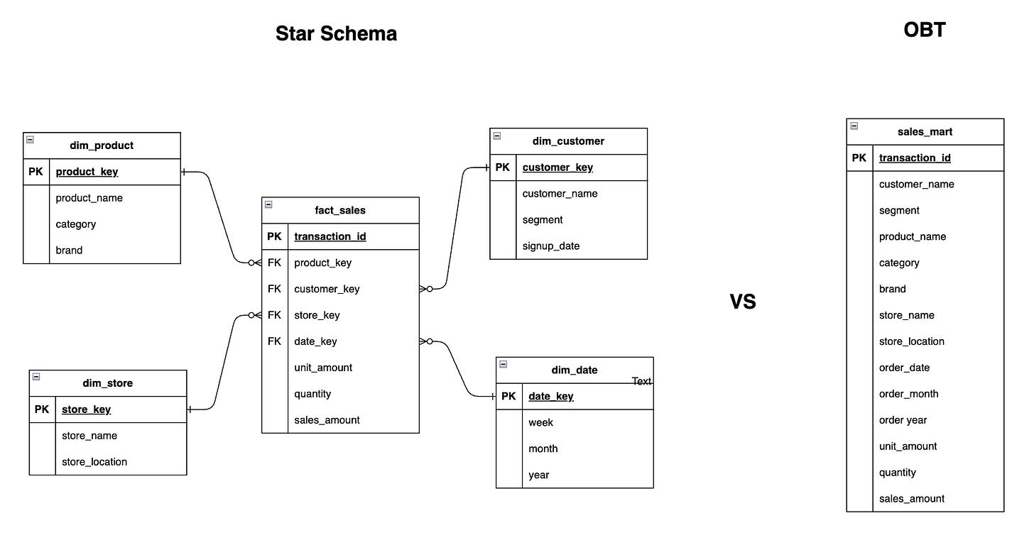 As the name suggests, OBT is an approach where all relevant data is combined into a single wide table for analysis. Instead of separating facts and dimensions, everything is denormalized into one table to simplify queries and improve performance.