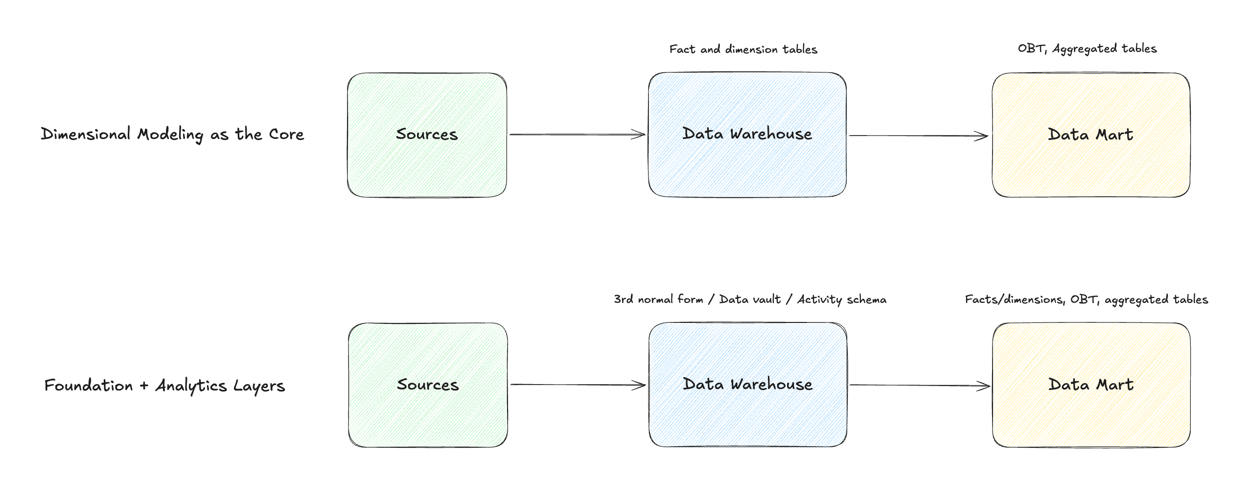 You’ll need to take a step back and look at the overall picture to make the decision on your data modeling approach. And the question should be more like “Where should you use dimensional modeling in your data process?“. Maybe you don’t need it after all, but as you can see in the following diagram, dimensional modeling can often be used with other modeling approaches: