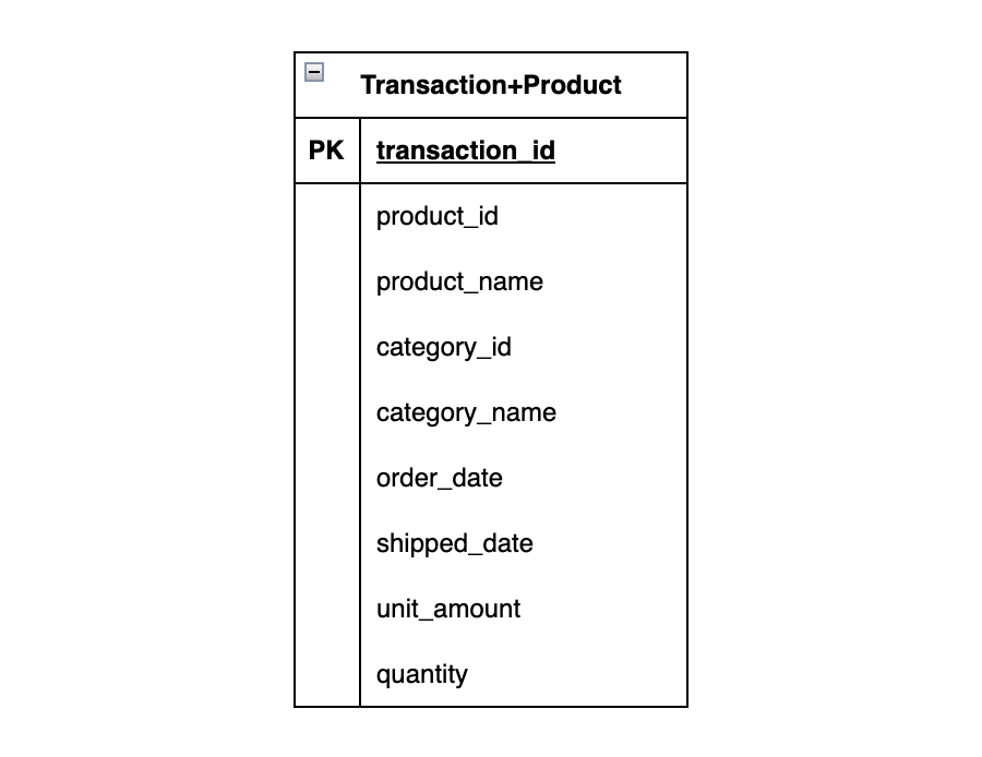 In a denormalized database, if you take the example I gave you earlier with Transaction, Product, and Category, it will look like something like this: