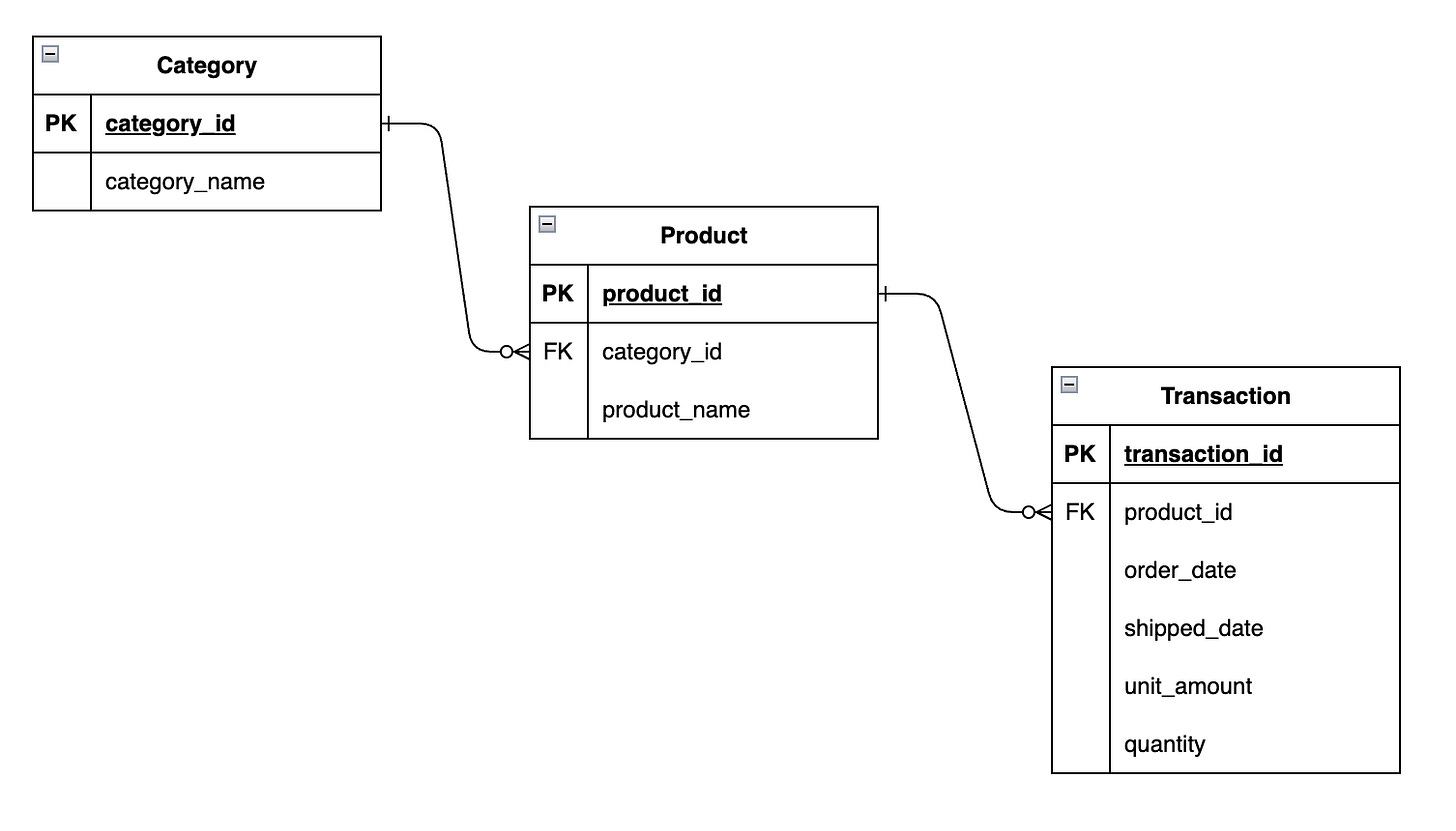 Now, let’s say you want to do some analytics on top of your normalized data. You want to see the number of orders per category. If this is the case, you need to join 2 tables, Category to Product and Product to Transaction, which isn’t ideal from the efficiency standpoint. Imagine if you had more tables in the chain up to the Transaction table, the query performance won’t be optimal. And this is where denormalization comes into play.