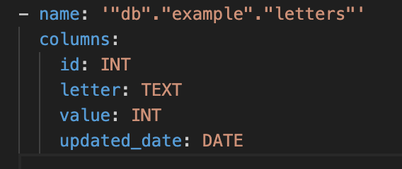 CREATE SCHEMA example;CREATE OR REPLACE TABLE example.letters (id INTEGER, letter CHAR(1), value INTEGER, updated_date DATE); Insert data: