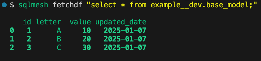 INSERT INTO example.letters VALUES (1, 'A', 10, '2025-01-07'), (2, 'B', 20, '2025-01-07'), (3, 'C', 30, '2025-01-07');Let’s check the table we just created: