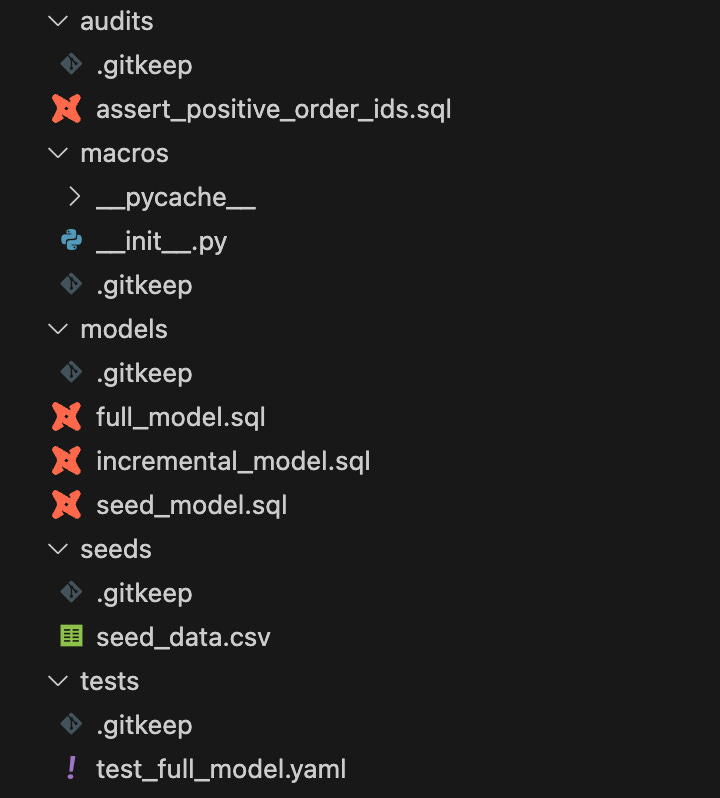 When you open up each folder, you’ll see some files (I have the dbt VSCode extension installed, which is why SQL files have a dbt icon):