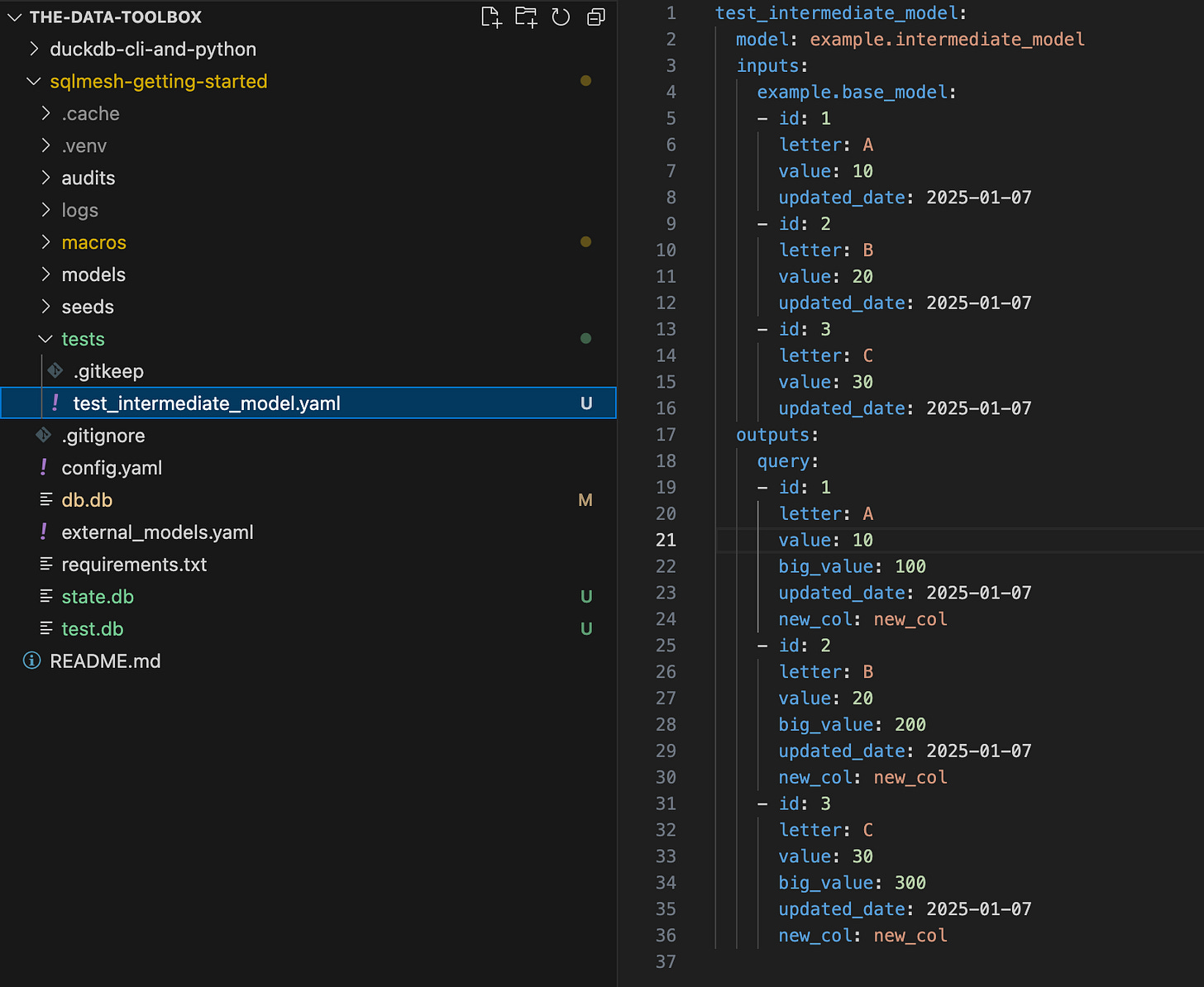 sqlmesh create_test example.intermediate_model --query example.base_model "SELECT * FROM example.base_model WHERE updated_date BETWEEN '2025-01-01' and '2025-01-15'" Here’s the test the above command generated for me: