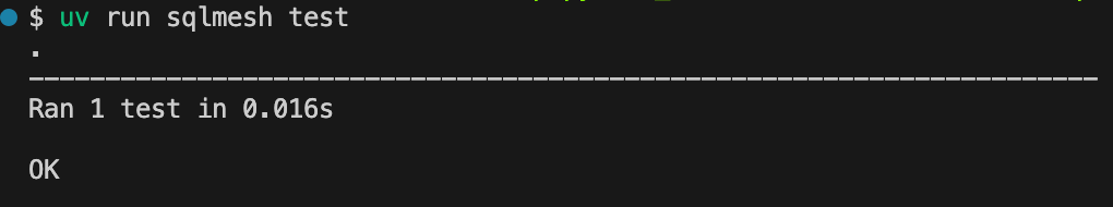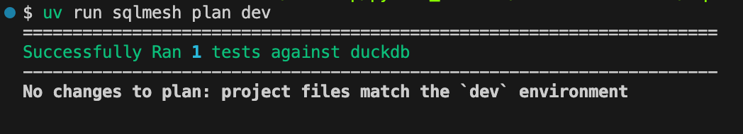 sqlmesh plan devsqlmesh testAnd if you remember we configured a different duckdb for the test connection. That means this test will be executed using the test connection, “test.db”, as opposed to “db.db”.