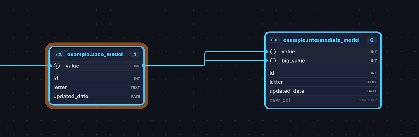 Do you want to see column-level lineage? You can just click on columns. For instance, let’s click on the `new_col`, `big_value`, and `value` columns in the `example.intermediate_model`: