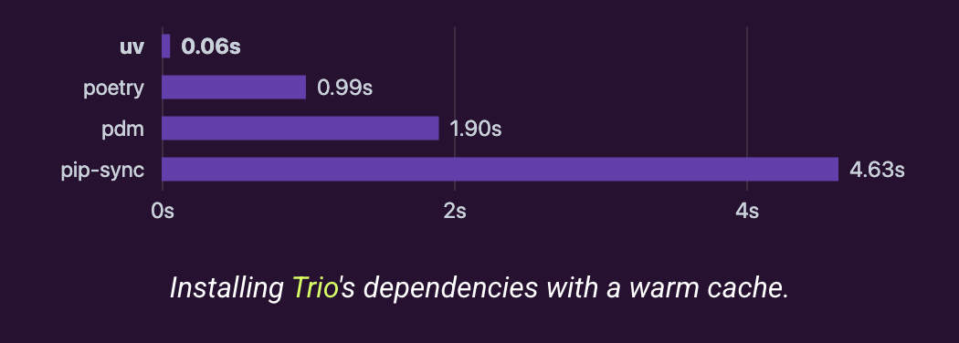 uv is fast. Using uv to install Python packages versus pip is like night and day. Although I haven’t timed it myself, there are many occasions where pip would make me wait several seconds, while uv feels almost instant and saves me a lot of time. More importantly, it just feels good to be able to install packages that fast. Here’s one benchmark the uv webiste published: