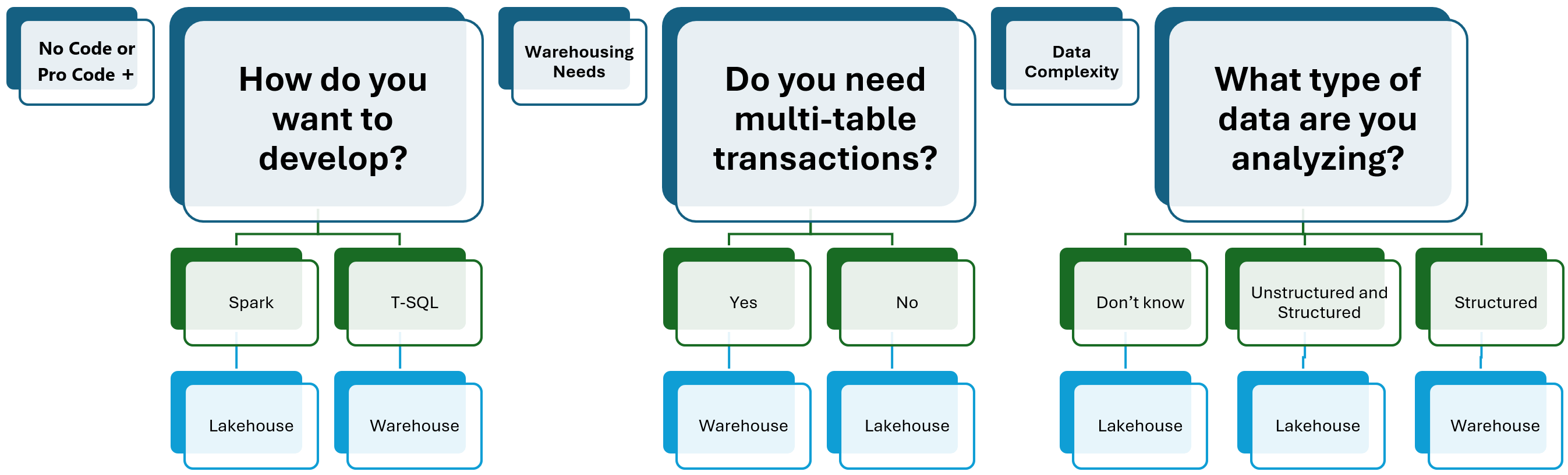 But even then, there are so many ways you can implement Fabric. Especially, whether to use Fabric Lakehouse vs Fabric Warehouse. The below screenshot shows how you might want to choose which one to use.